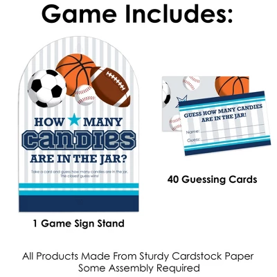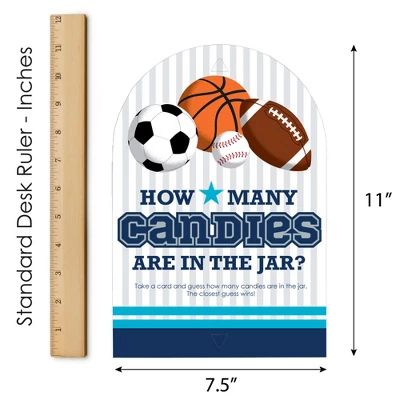 Go, Fight, Win – Sports Candy Guessing Game INCLUDES 1 sign with a built-in stand and 40 guessing cards that will look great at your Baby Shower or Birthday Party. Sign measures 7.5β wide by 11β tall and cards measure 3.5β by 2.25β tall. Candy and jar are not included. HOW TO PLAY: Draw attention to your candy jar with the Go, Fight, Win – Sports Candy Guessing Game! Place the sign and cards next to your candy jar. Guests can then take a card and guess how many candies are in the jar. The closest guess wins! EASY ASSEMBLY: To use, fold the sides of the stand towards the center. Then, fold down the support piece of the stand until it rests in the notches. Finally, display your Sports sign next to your container of candy. HIGH-QUALITY SUPPLY: Go, Fight, Win – Sports Candy Guessing Game is professionally printed double-sided on sturdy cardstock paper with a photo-like shine. They are individually inspected and then carefully packaged by hand. Sign arrives flat with some easy assembly required. MADE IN THE USA: Go, Fight, Win – Sports Candy Guessing Game is designed and manufactured at our Wisconsin facility using materials that are Made in the USA.