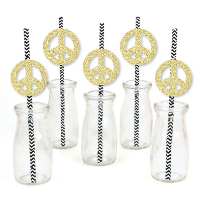 Gold Glitter Peace Sign Party Straws INCLUDES 24 no-mess real gold glitter cut-out shape Peace Sign, 24 black party straws and stickers. Party straw decor is ideal for a prom, homecoming or birthday party. PERFECT PARTY DECORATIONS: Gold Glitter Peace Sign cut-out shapes come in a set of 24 MEASURE 2.25 inches x 2.25 inches, paper party straws MEASURE 7.75 inches tall. Real gold glitter number Peace Sign gold straw decor is cut from no-mess glitter paper, making them perfect beverage straw, drink marker, swizzle stick or food pick. EASY TO USE: No-mess shaped cut out glitter confetti easily attaches to the fun party straws with the included adhesive stickers. Gold Glitter Peace Sign Party Straws – No-Mess Real Gold Glitter Cut-Out & Decorative Paper Straws are quick to assemble for your prom, homecoming or birthday party celebration. HIGH-QUALITY: Gold Glitter Peace Sign Cut-Out shapes are professionally cut from heavy-duty, cardstock glitter paper. They are then inspected for quality while being carefully hand-packed in sets of 24 along with 24 striped paper straws. Gold glitter Peace Sign shape confetti uses NO-MESS Real Gold Glitter Paper with white reverse side, eliminating glitter flake while maximizing bling effect! Please Note: Glasses shown for display purposes and are not included.