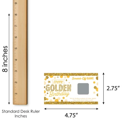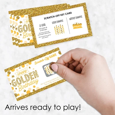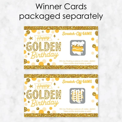 Big Dot of Happiness Gold Party Scratch-Off Cards INCLUDES 22 Birthday Party game cards: 20 “loser” cards and 2 “winner” cards. FUN PARTY GAME: Golden Birthday scratch-off cards will be enjoyed by Birthday Party guests of all ages. Each game card measures 2.75β tall x 4.75β wide. Winner and loser game cards are packaged separately so it is easy to pre-select the game winners if you choose. 3 WAYS TO PLAY: Simple – Greet guests as they arrive and hand them a scratch-off card. Quick – Display one scratch-off card at each place setting and have guests play before eating. Favorite – Give scratch-off cards out as mini prizes during other party games. The winning scratch off card(s) gets a grand prize. HIGH-QUALITY PARTY SUPPLIES: Gold Party Scratch-Off Cards are professionally printed on heavy-duty cardstock paper with a photo-like shine. They are individually inspected and carefully packaged by hand, with winner cards & loser cards clearly marked. This fun Birthday Party game will arrive ready to use at your party. MADE IN THE USA: Golden Birthday Party Game Scratch Off Cards are designed and manufactured at our Wisconsin facility using materials that are Made in the USA. Golden Birthday scratch off game cards use a No-Mess Glitter Print: Our games are designed with a printed image of glitter, eliminating glitter flake while maximizing bling effect!