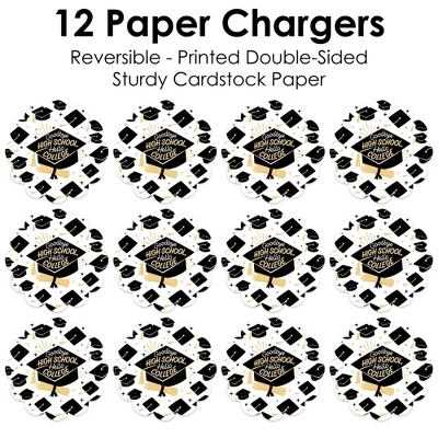 Goodbye High School, Hello College Paper Chargers INCLUDES set of 12 reversible round table decorations. Create an exciting look at your Graduation Party when you use paper chargers to elevate your table setting and accent your dinnerware. Tablescape Accent: Goodbye High School, Hello College chargers will add a festive flare to your tablescape. Whether it’s a large feast gathering or a close-knit gathering with the family, paper chargers will add a splash of color and are a great alternative to paper doilies. Easy Decor: Dress up your table with layers! Add a plate to the center of paper chargers. Black Themed paper charger is an easy solution for your table setting decor and perfect for complementing your tableware. The scallop border can be flared up for an elevated look and the backside can be used for an alternate look. High-Quality Supply: Goodbye High School, Hello College Paper Chargers are professionally printed double-sided on sturdy cardstock paper with a photo-like shine. Paper chargers measure 11.25″ in diameter and are the perfect final touch to complete your Graduation Party. Made In The USA: Goodbye High School, Hello College Paper Chargers are designed and manufactured at our Wisconsin facility using materials that are Made in the USA.