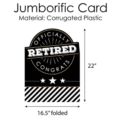 Happy Retirement Jumborific Card INCLUDES 1 giant greeting card made of corrugated plastic. Say a big Happy Retirement to show your congratulations with an oversized card. GIANT GREETING CARD: Front of card reads “Officially Retired Congrats”. Open card to “No Work Zone” message that is layered for extra dimension. Left side of inside will be blank with lots of room to handwrite personal messages. THANK YOU, CARD: Wow a friend, loved one, or coworker when you gift a Jumborific Card. The thick and sturdy plastic gives this card a unique display when in standing position and to be used for a memorable keepsake. HIGH-QUALITY PARTY GIFT: Happy Retirement Jumborific Card SIZE 16.5 inches wide (folded) x 22 inches tall. This giant greeting card is professionally printed on heavy-duty corrugated plastic with white edges. MADE IN THE USA: Big shaped Jumborific Card is designed and manufactured at our Wisconsin facility using materials that are Made in the USA. Happy Retirement Jumborific Card uses a No-Mess Glitter Print: Our giant greeting cards are designed with a printed image of glitter, eliminating glitter flake while maximizing bling effect!
