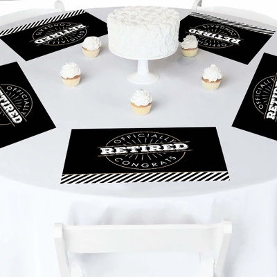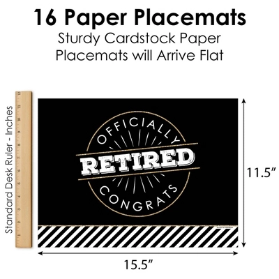 Happy Retirement Placemats INCLUDE: 16 paper placemats. Placemats will arrive flat and party ready! EASY CLEAN UP: Happy Retirement paper placemats SIZE 15.5 inches wide x 11.5 high. Made of sturdy cardstock paper, these disposable placemats will make it easy to clean up after the party is over. Party placemats are perfect for at-home dining tables or to bring to your favorite restaurant as an easy decoration. PARTY TABLE DECORATIONS: Placemats are a fun and easy party table decoration for a Happy Retirement party. Use Happy Retirement party placemats to style dining tables, buffet tables, banquet halls, and more! Happy Retirement party table decoration placemats will make a statement however you choose to use them. PAPER PLACEMATS: Set of 16 Happy Retirement placemats are professionally printed on sturdy cardstock paper. Each placemat is individually inspected and carefully packaged to arrive flat. MADE IN THE USA: Happy Retirement paper party placemats are designed and manufactured at our Wisconsin facility using materials that are Made in the USA. Happy Retirement paper placemats use a No-Mess Glitter Print: Our placemats are designed with a printed image of glitter, eliminating glitter flake while maximizing bling effect!