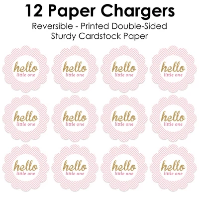 Hello Little One Paper Chargers INCLUDES set of 12 reversible round table decorations. Create an exciting look at your Baby Shower when you use paper chargers to elevate your table setting and accent your dinnerware. Tablescape Accent: Hello Little One chargers will add a festive flare to your tablescape. Whether it’s a large feast gathering or a close-knit gathering with the family, paper chargers will add a splash of color and are a great alternative to paper doilies. Easy Decor: Dress up your table with layers! Add a plate to the center of paper chargers. Pink and Gold Themed paper charger is an easy solution for your table setting decor and perfect for complementing your tableware. The scallop border can be flared up for an elevated look and the backside can be used for an alternate look. High-Quality Supply: Hello Little One Paper Chargers are professionally printed double-sided on sturdy cardstock paper with a photo-like shine. Paper chargers measure 11.25” in diameter and are the perfect final touch to complete your Baby Shower. Made In The USA: Hello Little One Paper Chargers are designed and manufactured at our Wisconsin facility using materials that are Made in the USA.