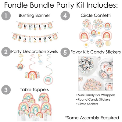 BUNTING BANNER includes: letter and themed pennants. Each pennant measures 8.5″ high x 5.5″ wide. Pennants are numbered in sequence and ribbon is included for easy assembly. PARTY DECORATION SWIRLS includes: 4 different shapes, 10 count per shape, that hang below an accordion-style spiral. Professionally printed double-sided, each decoration swirl in the 40-piece set has a pre-cut hole for easy assembly using the included clear hooks. Party decoration swirls will arrive flat. TABLE TOPPERS includes: 15 Hello Rainbow centerpiece sticks in three different shapes, each professionally printed double-sided. To use as centerpieces or photo props, wooden dowels and assembly stickers are included. CIRCLE CONFETTI includes: three different sizes of circles – 12 small circles, size 2.75″, 9 medium circles, size 4.25″, and 6 large circles, size 5.5″. Professionally printed double-sided with coordinating Boho Rainbow designs, circle confetti can be scattered around your table. FAVOR KIT: CANDY STICKERS includes: 2 sheets mini candy bar wrappers (total 40), 2 sheets round candy stickers (total 216), 2 sheets circle stickers (total 48). Easy assembly with this peel and stick favor kit. Simply center and press stickers onto your favorite candies to style candy buffets or decorate take-home favors for party guests. Note: Candy is not included.