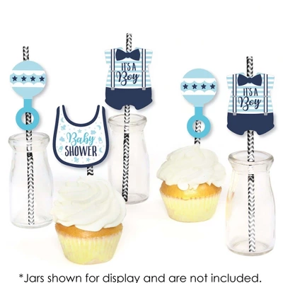 It’s A Boy Straw Decor INCLUDES 24 blue paper cut outs, 24 coordinating paper straws & 40 clear stickers for easy assembly. It’s A Boy DIY party supplies are perfect for a baby shower. Boy Straw Decor party kit SIZE 8 bodysuit paper die cuts (2″ X 2.75″), 8 rattle paper die cuts (1.5″ X 3″), 8 bib paper die cuts (2.5″ X 2.75″) and 24 chevron striped paper straws 7.75″ tall. EASY PARTY DECORATIONS: It’s A Boy straw decor will add a touch of charm to your baby shower tables. It’s A Boy straw decor will also look great at your beverage bar. Use these adorable It’s A Boy party accessories as straws or swizzle sticks. The paper straws can also be cut in half and used as cupcake picks once the shaped cut out is attached. PREMIUM PARTY SUPPLIES: It’s A Boy paper cut out straw decorations are professionally printed on heavy-duty card stock paper with a photo-like shine. They are individually inspected and carefully packaged by hand, along with coordinating paper straws. Oh Boy Straw Decor will require some easy assembly. Simply adhere the shaped cut outs to the straws using the included clear stickers. Get creative with your DIY baby shower decoration ideas! Please Note: Mason Jars shown for display purposes and are not included.