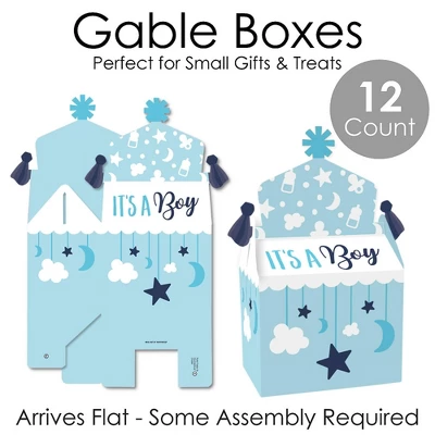 Gable Boxes INCLUDE: 12 It’s a Boy-themed goodie party favor boxes. Each box SIZE measures 4.25 inches length x 3 inches width x 7.75 inches height. Gable favor boxes are ideal for small gifts and treats that are under 3.5 inches tall (height for storing items in closed box). FUN PARTY FAVORS: Use gable boxes for a unique party gift at any celebration party. This small, closed favor box can be filled with baked goodies, party trinkets, or thank you gifts. Party guests will have fun with the mystery of what each party loot box will contain. PREMIUM PARTY SUPPLY: Gable treat boxes are professionally printed and double-sided on heavy-duty cardstock paper, with a photo-like shine. They are hand-folded, individually inspected, and then carefully packaged. SIMPLE ASSEMBLY: It’s a Boy gable boxes will arrive flat. Allow time for the required assembly of each box. Gable boxes have crease lines and numbered tabs for easy folding. Packaging will include assembly instructions. MADE IN THE USA: It’s a Boy Baby Shower goodie gable boxes are designed and manufactured at our Wisconsin facility using materials that are Made in the USA.