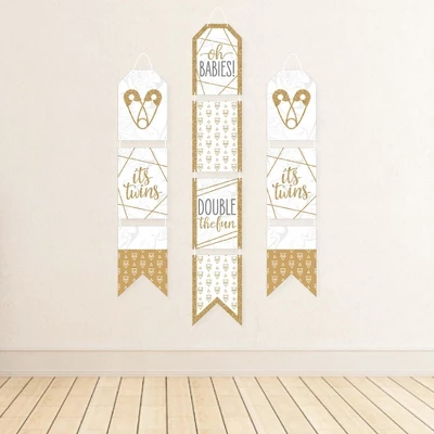 It’s Twins Indoor Door Decor INCLUDES: 10 heavy-duty paper pieces to create 3 vertical banners and 10 yards white 2mm satin cord. Easy assembly required. FUN PARTY BANNER: Vertical hanging door banners will create that wow-factor at your gold baby shower. Hang at the entrance of your event, over the food or gift table, or any open wall space to create a fun focal point. WALL DECORATION KIT: All banner sign pieces SIZE 7.5 inches wide x 10.75 inches. Each piece has pre-cut holes for easy DIY hanging with the included 10 yards of white 2mm satin cord. This DIY banner decor kit allows you to choose the spacing between each piece and string the cording through at your desired length. Clear adhesive stickers are also included to secure cording onto the back of each banner piece. PREMIUM PARTY SUPPLIES: It’s Twins hanging vertical door banner decoration pieces are professionally printed one-sided on heavy-duty cardstock paper. Each banner piece is individually inspected and carefully packaged by hand. Twins wall decoration kit requires some easy assembly. Follow the number sequence on the back of each banner piece and simply string the included cording through the pre-cut holes. MADE IN THE USA: It’s Twins paper door banner decoration kit is designed and manufactured at our Wisconsin facility using materials that are Made in the USA. It’s Twins Indoor Door Decor use a No-Mess Glitter Print: Our DIY party banner decorations are designed with a printed image of glitter, eliminating glitter flake while maximizing bling effect!