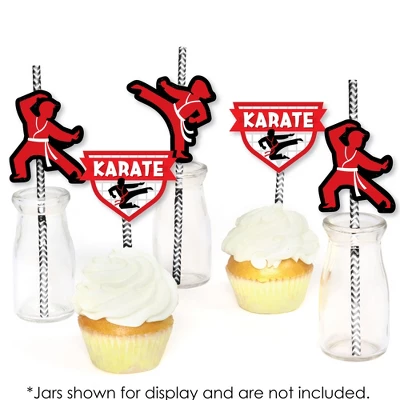 Karate Master Straw Decor INCLUDES 24 Martial Arts paper cut outs, 24 coordinating paper straws, and 40 clear stickers for easy assembly. Karate Master DIY party supplies are perfect for a Birthday Party or Belt Ceremony. Martial Arts Straw Decor party kit SIZE 6 – Front Stance Shape 1 Paper Die Cuts (2.25” x 2.75”), 6 – High Punch Shape 2 Paper Die Cuts (3” x 2.75”), 6 – “Karate” Shape 3 Paper Die Cuts (3” x 2.25”), 6 – Side Kick Shape 4 Paper Die Cuts (2.75” x 2.75’), and 24 chevron striped paper straws 7.75″ tall. EASY PARTY DECORATIONS: Karate Master straw decor will add a touch of style to your Birthday Party or Belt Ceremony tables. Martial Arts straw decor will also look great at your beverage bar. Use these adorable Martial Arts party accessories as straws or swizzle sticks. The paper straws can also be cut in half and used as cupcake picks once the shaped cut out is attached. PREMIUM PARTY SUPPLIES: Karate Master paper cut out straw decorations are professionally printed on heavy-duty cardstock paper with a photo-like shine. They are individually inspected and carefully packaged by hand, along with coordinating paper straws. Martial Arts Straw Decor will require some easy assembly. Simply adhere the shaped cut outs to the straws using the included clear stickers. Get creative with your DIY Birthday Party or Belt Ceremony decoration ideas! Please Note: Mason Jars shown for display purposes and are not included.