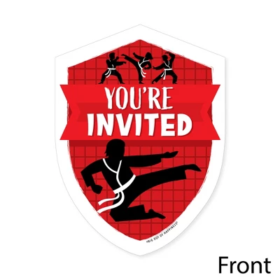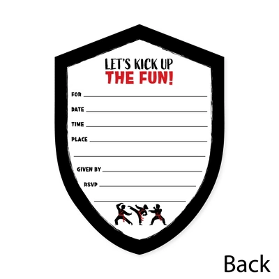 Karate Master Fill-In the Blank Invitation Set INCLUDES 12 Martial Arts party invitations and 12 premium white envelopes. Karate Master fill-in invitation is perfect for any event. The Martial Arts theme is great for a Birthday Party or Belt Ceremony. “You’re Invited” Martial Arts party invitations SIZE 5 inches by 7 inches. The included envelopes measure 5 inches by 7 inches. “Let’s Kick up the Fun!” The back of each Karate Master Birthday Party or Belt Ceremony invitation has a “handwrite your information here” space to add your party details: For: Date: Time: Place: Given By: RSVP: PREMIUM PARTY INVITATIONS: Martial Arts party invitation is professionally printed on heavy-duty card stock paper with a photo-like shine. They are individually inspected, then carefully packaged with our exclusive squiggle flap envelopes, making this Karate Master stationery set a must-have for any Birthday Party or Belt Ceremony. MADE IN THE USA: Karate Master – Birthday Party or Belt Ceremony Invitations are designed and manufactured at our Wisconsin facility using materials that are Made in the USA.