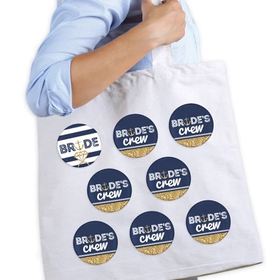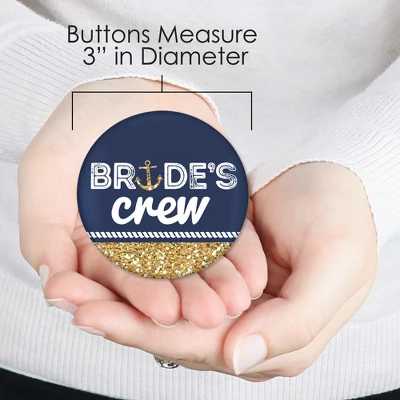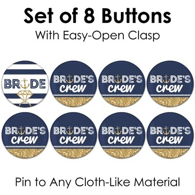 Last Sail Before The Veil Pinback Buttons INCLUDES 8 sturdy, round pinback buttons. Each set of 8 Nautical Bridal buttons arrives assembled and ready for showing the world your special message. MESSAGES MADE-EASY: Last Sail Before The Veil Pinback Buttons are round-shaped, measuring 3 inches in diameter. Each set includes 1 “Bride” and 7 “Bride’s Crew”, easy-to-wear buttons; perfect for making a statement! Pass out to your group at bachelorette parties, bridal showers, and special gatherings, or hand out individually. ORIGINAL BUTTON SET: These fully assembled buttons have a metal shell with an easy-open, straight metal clasp backer. You can pin easily onto any cloth-like materials such as canvas tote bags, jackets, shirts, backpacks, and hats! Designed to be trendy and stylish, this set of 8 full-color buttons will get all the attention. STURDY AND DURABLE: Last Sail Before The Veil Pinback Buttons are made with sturdy, metal backers and shells with a glossy finish. Buttons are reusable and can easily be cleaned as needed. MADE IN THE USA: Last Sail Before The Veil Pinback Buttons are designed and manufactured at our Wisconsin facility using materials that are Made in the USA. Last Sail Before The Veil Pinback Buttons use a No-Mess Glitter Print: Our buttons are designed with a printed image of glitter, eliminating glitter flake while maximizing bling effect!