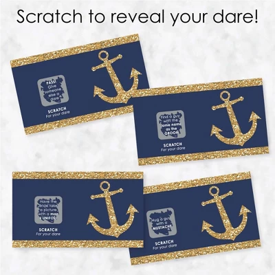 Last Sail Before The Veil Scratch-Off Dare Cards INCLUDES 22 bridal shower or bachelorette party game cards with unique dares on each card. FUN PARTY GAME: Last Sail Before The Veil Scratch-Off Dare Cards will be enjoyed by bridal shower or bachelorette party guests of all ages. Each game card measures 2.75″ tall x 4.75″ wide. Scratch-off dares aren’t very risque, so you can have a fun night out without next-day regrets. Recommended for ages 21 years and up. 3 WAYS TO PLAY: Simple – Hand out cards all at once or distribute throughout the night. Each cardholder scratches off their card to reveal their dare. Twist – Guests can opt out of their dare by buying the Bride-To-Be a drink! Truth-Or-Dare – Opt out of a dare by answering a “TRUTH” question from the Bride-To-Be. HIGH-QUALITY PARTY SUPPLIES: Last Sail Before The Veil Scratch-Off Dare Cards are professionally printed on heavy-duty cardstock paper with a photo-like shine. They are individually inspected and carefully packaged by hand. This fun bridal shower or bachelorette party game will arrive ready to use at your party. MADE IN THE USA: Last Sail Before The Veil – Nautical Bridal Shower & Bachelorette Party Game Scratch Off Dare Cards are designed and manufactured at our Wisconsin facility using materials that are Made in the USA. Last Sail Before The Veil scratch off game cards use a No-Mess Glitter Print: Our games are designed with a printed image of glitter, eliminating glitter flake while maximizing bling effect!