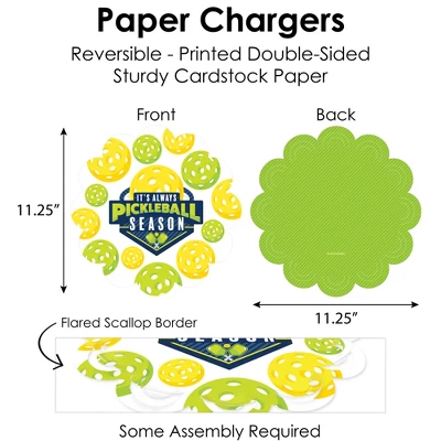 - Paper Chargers: Includes 8 reversible round table decorations – 11.25″ in diameter. Design Reads: “It’s Always Pickleball Season”
