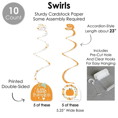 SWIRLS includes: 10 total swirls with 2 designs – 5 count per design, that hang with an accordion-style spiral. Professionally printed double-sided, the Little Pumpkin decoration swirls come with a 5.25” wide base and a spiral length of about 23” long. Each decoration swirl comes with a pre-cut hole and clear hooks for easy assembly. BUNTING BANNER includes: letter and themed pennants, perfect for your Orange Pumpkin Fall Birthday Party or Baby Shower. Each pennant measures 5” wide x 7.25” tall. Pennants are numbered in sequence and ribbon is included for easy assembly. TABLE TOPPERS includes: 10 centerpiece sticks that come with two shape cut-out designs, each professionally printed double-sided. The centerpiece shapes measure 7.5” wide x 5” tall. To use as centerpieces or photo props for your Fall Birthday Party or Baby Shower, assembly stickers are included for the easy DIY required assembly. CIRCLE CONFETTI includes: 30 paper circles with 2 different sizes – 10 large circles, size 3.5” and 20 small circles, size 2.75”. Professionally printed double-sided, the Little Pumpkin circle confetti can be placed flipped over for added variety. Scatter around your table for a delightful accent. MADE IN THE USA: Little Pumpkin Decor Galore Party Pack is designed and manufactured at our Wisconsin facility using materials that are Made in the USA.
