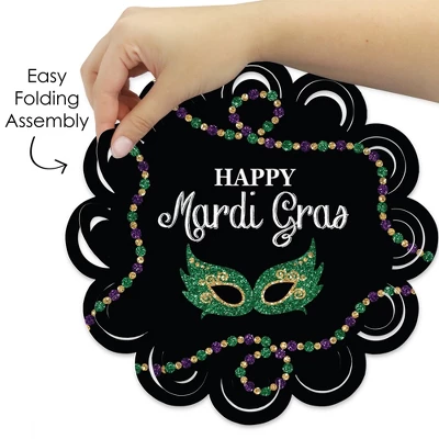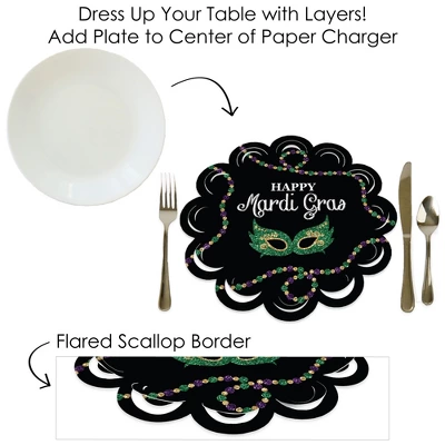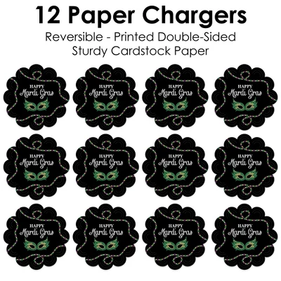 - Professionally Printed Double-Sided On Sturdy Cardstock Paper. Charger Design Reads: “Happy Mardi Gras”