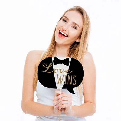 20-Piece LGBTQ Photo Booth Props Kit INCLUDES 20 Mr. & Mr. – Gold photo booth props, 20 sticks and adhesives for assembly. EASY ASSEMBLY: Simply attach the printed DIY photo booth props to the sticks with included adhesive and reinforcing stickers. PERFECT FOR ANY CROWD! Photo booth props are fun wedding party supplies for adults and kids – everyone will love the funny faces on these Mr. & Mr. – Gold photo booth props. Take entertaining and shareable party photos of your friends and family while making memories with these stylish photo booth props! WEDDING DECORATION IDEAS: There are many fun ways to use these cute photo booth props! Use as intended at your wedding and take party photos to share; add them to vases and floral arrangements as a fun black and gold centerpiece; or accent your gay wedding theme by displaying them in decorative candy jars! HIGH-QUALITY PARTY SUPPLIES: Mr. & Mr. – Gold photo booth props are professionally printed on thick cardstock paper. They will arrive cut out and ready to assemble with the included sticks and adhesives. Mr. & Mr. – Gold photo booth props use a No-Mess Glitter Print: Our photo booth props are designed with a printed image of glitter, eliminating glitter flake while maximizing bling effect! MADE IN THE USA: Mr. & Mr. – Gold – Gay Wedding LGBTQ Photo Booth Props Kit is designed and manufactured at our Wisconsin facility using materials that are Made in the USA.