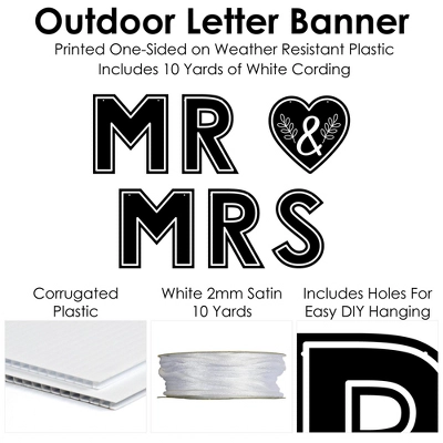 Mr. and Mrs. Outdoor Letter Banner Decoration INCLUDES MR & MRS pieces and white cording for hanging. Requires some easy assembly. This Wedding or Bridal Shower decor is fun way to celebrate and brighten up your outdoor area! YARDTASTIC: Mr. and Mrs. Outdoor Letter Banner SIZE: letters measure 14.25 inches tall and heart shape measures 14.5 inches x 14 inches. Includes 10 yards of white cording. Made of sturdy plastic with single-sided print, this letter banner can be hung on a fence, porch, or between your backyard trees to make your yard the most fantastic one on the block! Waterproof and weather resistant, the banner can be reused again and again. EASY ASSEMBLY: Mr. and Mrs. Outdoor Letter Banner requires some easy assembly. Start on one side of the banner arrangement and string cording through the first hole, from front to back. Continue stringing the cording through all pieces, with cording facing the back, and hang the banner in desired location. PREMIUM OUTDOOR PARTY DECORATIONS: Mr. and Mrs. Outdoor Letter Banners are professionally printed on sturdy, corrugated plastic with single-sided print. They are individually inspected and carefully packaged by hand. MADE IN THE USA: Mr. and Mrs. Outdoor Letter Banners are designed and manufactured at our Wisconsin facility using materials that are Made in the USA.