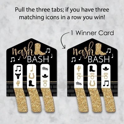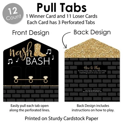 Nash Bash Pull Tabs 3-in-a-Row INCLUDES 12 pull tab game cards with 1 winning card and 11 losing cards. Great for a Nashville Bachelorette Party, these game cards are for entertainment purposes only. FUN FOR ALL: The Nash Bash 3-in-a-Row pickle cards are the perfect way to add excitement to your event! Prize is determined by the event host. HOW TO PLAY: Hand out one Pull Tab Game Card to each player. Players will then pull each tab open along the perforated lines. If there are three matching icons in a row, the player wins! HIGH-QUALITY: Nash Bash Pull Tabs 3-in-a-Row Cards are professionally printed double-sided on sturdy cardstock paper with a photo-like shine. They are individually inspected and carefully packaged by hand. MADE IN THE USA: Nash Bash Pull Tabs 3-in-a-Row is designed and manufactured at our Wisconsin facility using materials that are Made in the USA. Nash Bash Pull Tabs uses a No-Mess Glitter Print: Our Pull Tabs are designed with a printed image of glitter, eliminating glitter flake while maximizing bling effect!