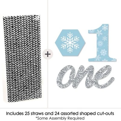 Winter Wonderland Straw Decor INCLUDES 24 snowflake paper cut outs, 24 coordinating paper straws & 40 clear stickers for easy assembly. Winter Wonderland DIY party supplies are perfect for a birthday party. Winter Wonderland Straw Decor party kit SIZE 8 # one 2″ wide x 2.75″ tall; 8 one (words) 4.25″ wide x 1.75″ tall; 8 hexagon 2.25″ wide x 2″ tall; and 24 chevron striped paper straws 7.75″ tall. EASY PARTY DECORATIONS: Winter Wonderland straw decor will add a touch of charm to your birthday party tables. Onderland straw decor will also look great at your beverage bar. Use these adorable blue and silver party accessories as straws or swizzle sticks. The paper straws can also be cut in half and used as cupcake picks once the shaped cut out is attached. PREMIUM PARTY SUPPLIES: Winter Wonderland paper cut out straw decorations are professionally printed on heavy-duty card stock paper with a photo-like shine. They are individually inspected and carefully packaged by hand, along with coordinating paper straws. Winter Wonderland Straw Decor will require some easy assembly. Simply adhere the shaped cut outs to the straws using the included clear stickers. Get creative with your DIY birthday party decoration ideas! Please Note: Mason Jars shown for display purposes and are not included. Winter Wonderland – Striped Decorative Straws use a No-Mess Glitter Print: Our wrappers are designed with a printed image of glitter, eliminating glitter flake while maximizing bling effect!