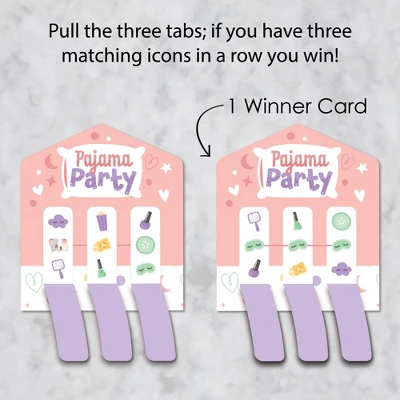 Pajama Slumber Party Pull Tabs 3-in-a-Row INCLUDES 12 pull tab game cards with 1 winning card and 11 losing cards. Great for a Girls Sleepover Birthday Party, these game cards are for entertainment purposes only. FUN FOR ALL: The Pajama Slumber Party 3-in-a-Row pickle cards can be played by children and adults. It’s the perfect way to add excitement to your event! Prize is determined by the event host. HOW TO PLAY: Hand out one Pull Tab Game Card to each player. Players will then pull each tab open along the perforated lines. If there are three matching icons in a row, the player wins! HIGH-QUALITY: Pajama Slumber Party Pull Tabs 3-in-a-Row Cards are professionally printed double-sided on sturdy cardstock paper with a photo-like shine. They are individually inspected and carefully packaged by hand. MADE IN THE USA: Pajama Slumber Party Pull Tabs 3-in-a-Row is designed and manufactured at our Wisconsin facility using materials that are Made in the USA.
