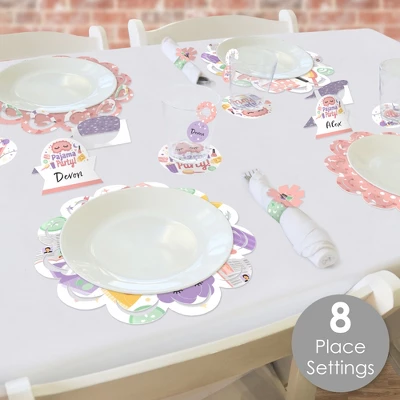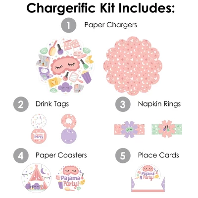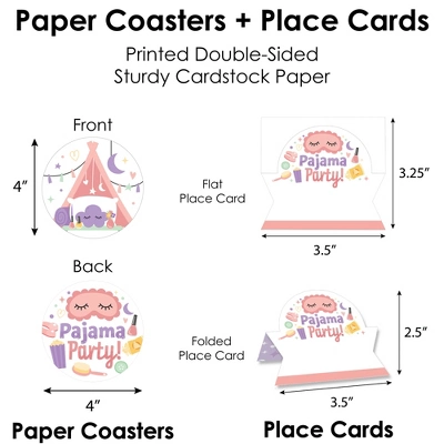 Paper Chargers: Includes 8 scalloped-edge table decorations that are the perfect base for your meal plates. Each place setting charger measures 11.25” in diameter and is a great substitute for a paper doily. They come with a scallop border that can be flared up for an elevated look. Professionally printed double-sided on sturdy cardstock paper, paper chargers are reversible for an alternate look. Napkin Rings: Includes 8 DIY Pajama Slumber Party paper napkin rings with tassel-shaped ends. Professionally printed double-sided on sturdy cardstock paper, each napkin ring holder is reversible and measures 2.25” wide by 2.25” tall when assembled. To use, carefully curve each ring without creasing and connect by interlocking the tassel-shaped ends together. Jammies Drink Tags: Includes 8 paper drink charms that are perfect for accessorizing your drinkware. Each beverage tag is professionally printed double-sided on sturdy cardstock paper with space on the backside for handwritten personalization. Drink tags measure 1.5” wide by 2.75” and will look great on the stem of a glass or on the rim of your cup. Place Cards: Includes 8 Pajama Slumber Party name cards that are professionally printed double-sided on sturdy cardstock paper and measure 3.5” wide by 2.5” tall when assembled. To use, push back the top outer edge, revealing the half-circle top. Fold along the pre-scored line in the center to create the tent shape, and then display! Paper Coasters: Includes 8 Jammies themed reversible circles that perfectly highlight your drinkware. Each beverage coaster is professionally printed double-sided on sturdy cardstock paper and measures 4” in diameter.