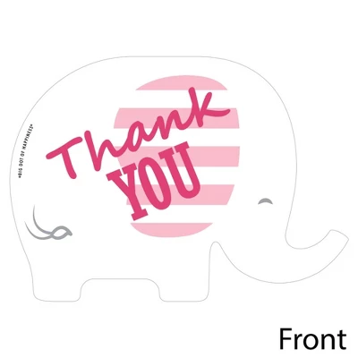 Shaped Thank You Cards Set INCLUDES 12 Pink Elephant baby shower or birthday party thank you cards and 12 premium white envelopes. Pink Elephant Shaped Thank You Cards are the perfect end to any event. Girl elephant party thank you note cards SIZE 7 inches by 5 inches. The included envelopes measure to fit 5 inches by 7 inches cards. The back of each Pink Elephant baby shower or birthday party thank you has space to write a personal message of thanks. PREMIUM PARTY THANK YOU CARDS: Pink Elephant party thank you cards are professionally printed on heavy-duty cardstock paper with a photo-like shine. They are individually inspected, then carefully packaged with our exclusive squiggle flap envelopes, making this Pink Elephant stationary set a must-have for any baby shower or birthday party. MADE IN THE USA: Pink Elephant Party Thank You Cards are designed and manufactured at our Wisconsin facility using materials that are Made in America.