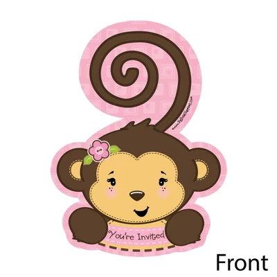 Monkey Girl Fill-In the Blank Invitation Set INCLUDES 12 pink monkey party invitations and 12 premium white envelopes. Monkey Girl fill-in invitation is perfect for any event. The Monkey Girl theme is great for a baby shower or birthday party. Monkey Girl party invitations SIZE 5 inches by 7 inches. The included envelopes measure 5 inches by 7 inches. The back of each Monkey Girl baby shower or birthday party invitation has space to add your party details: For: Date: Time: Place: Given By: RSVP: PREMIUM PARTY INVITATIONS: Pink monkey party invitation are professionally printed on heavy-duty card stock paper with a photo-like shine. They are individually inspected, then carefully packaged with our exclusive squiggle flap envelopes, making this Monkey Girl stationary set a must-have for any baby shower or birthday party. MADE IN THE USA: Monkey Girl – Baby Shower or Birthday Party Invitations are designed and manufactured at our Wisconsin facility using materials that are Made in the USA.