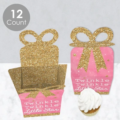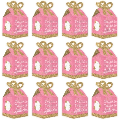 Bow Boxes INCLUDE: 12 Twinkle Twinkle Little Star-themed square favor gift boxes. Each box SIZE measures 3.5 inches length x 3.5 inches width x 7 inches height. Bow boxes are ideal for small gifts and treats that are under 3.5 inches tall (height for storing items in closed box). When assembled and closed, each box creates a 3D paper bow-shaped top with a square bottom. CUTE GIFT BOXES: This small, closed favor box can be filled with homemade treats (fun cupcake box), party trinkets, or thank you gifts. At the party, have each guest fill their Sparkling Pink and Gold bow box with snacks from a candy buffet or use as a party loot box. Guests will have fun guessing what surprise each favor gift box contains. PREMIUM PARTY SUPPLY: Bow boxes are professionally printed and double-sided on heavy-duty cardstock paper, with a photo-like shine. They are hand-folded, individually inspected, and then carefully packaged. EASY ASSEMBLY: Twinkle Twinkle Little Star bow boxes will arrive flat. Each bow box has crease lines and numbered tabs for easy folding. Finish the DIY assembly by interlocking top of box to create a three-dimensional bow. Packaging will include assembly instructions. MADE IN THE USA: Sparkling Pink and Gold Baby Shower or Birthday Party bow boxes are designed and manufactured at our Wisconsin facility using materials that are Made in the USA. Twinkle Twinkle Little Star bow boxes use a No-Mess Glitter Print: Our DIY favor boxes are designed with a printed image of glitter, eliminating glitter flake while maximizing bling effect!