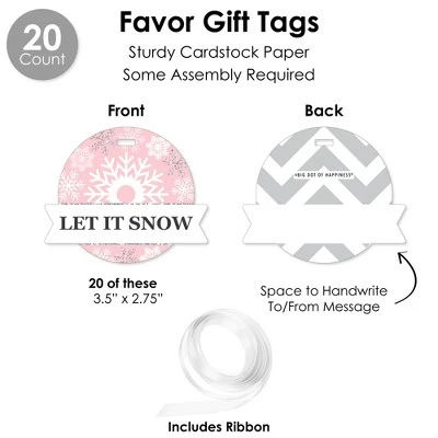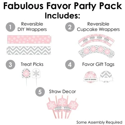 DIY WRAPPERS includes: 20 total reversible wrappers that are 10.75” wide x 2” tall. When wrapped, they can accommodate favors 1.75” to 2.5” in diameter. Professionally printed double-sided on sturdy cardstock paper, these wrappers for a Winter Party are easy to secure on a variety of items like beverage containers, vases, napkins, and more by wrapping around and sliding the tab into the appropriate slit. CUPCAKE WRAPPERS includes: 20 total cupcake wrappers that adjust to fit 1.75” – 2.5” wide x 1.75” tall. Professionally printed double-sided on sturdy cardstock paper, Snowflake cupcake wrappers will fit over cupcake liners on standard and medium-sized cupcakes and are reversible. Secure cupcake wrappers by sliding the tab into appropriate slit. TREAT PICKS includes: 20 total shaped cut-outs – 2” wide x 2.25” tall and clear treat picks – 4” tall. Snowflake paper cut-outs come in 2 designs that are a great for styling food being served. Assembly stickers are included for easy DIY required assembly. FAVOR GIFT TAGS includes: 20 total gift tag paper cut-outs – 3.5” wide by 2.75” tall and satin ribbon. Professionally printed double-sided on sturdy cardstock paper, write a special message in the blank space on the back side of Pink Winter Wonderland gift tags for a personal touch. STRAW DECOR includes 20 total shaped cut-outs with 2 designs – 10 count each, size 2.25” wide by 2.25” tall and chevron striped paper straws – 7.75” tall. Shaped cut-outs are professionally printed on sturdy cardstock paper. For easy assembly, create your stylish drinks by attaching Snowflake shaped cut-outs to paper straws with clear stickers included. Favor party pack is designed and manufactured at our Wisconsin facility using materials that are Made in the USA. Favor pack uses a No-Mess Glitter Print: Designed with a printed image of glitter, eliminating glitter flake while maximizing bling effect!