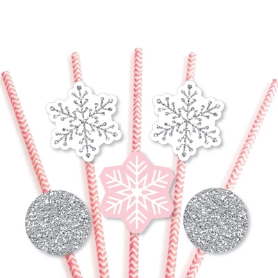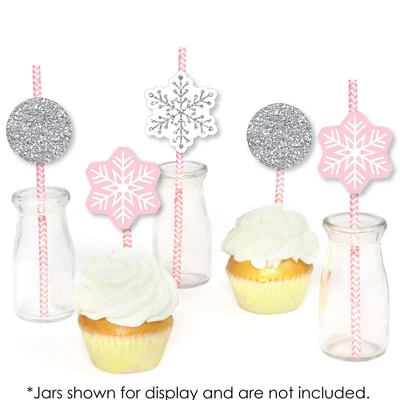 Pink Winter Wonderland Straw Decor INCLUDES 24 zombie paper cut outs, 24 coordinating paper straws & 40 clear stickers for easy assembly. Pink Winter Wonderland DIY party supplies are perfect for a holiday, baby shower or birthday party. Pink Snowflake Straw Decor party kit SIZE 8 pink snowflake 2.25″ wide x 2.5″ tall; 8 circle 2″ wide x 2″ tall; 8 silver snowflake 2.25″ wide x 2.5″ tall; and 24 chevron striped paper straws 7.75″ tall. EASY PARTY DECORATIONS: Pink Winter Wonderland straw decor will add a touch of charm to your holiday, baby shower or birthday party tables. Pink snowflake straw decor will also look great at your beverage bar. Use these adorable snowflake party accessories as straws or swizzle sticks. The paper straws can also be cut in half and used as cupcake picks once the shaped cut out is attached. PREMIUM PARTY SUPPLIES: Pink Winter Wonderland paper cut out straw decorations are professionally printed on heavy-duty card stock paper with a photo-like shine. They are individually inspected and carefully packaged by hand, along with coordinating paper straws. Pink Winter Wonderland Straw Decor will require some easy assembly. Simply adhere the shaped cut outs to the straws using the included clear stickers. Get creative with your DIY holiday, baby shower or birthday party decoration ideas! Please Note: Mason Jars shown for display purposes and are not included. Pink Winter Wonderland – Striped Decorative Straws use a No-Mess Glitter Print: Our wrappers are designed with a printed image of glitter, eliminating glitter flake while maximizing bling effect!