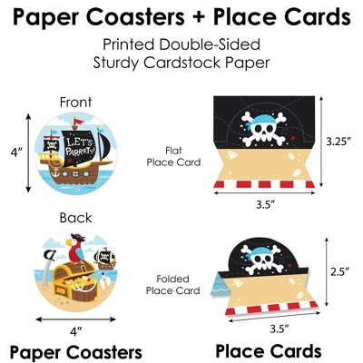 Paper Chargers: Includes 8 scalloped-edge table decorations that are the perfect base for your meal plates. Each place setting charger measures 11.25” in diameter and is a great substitute for a paper doily. They come with a scallop border that can be flared up for an elevated look. Professionally printed double-sided on sturdy cardstock paper, paper chargers are reversible for an alternate look. Napkin Rings: Includes 8 DIY Pirate Ship Adventures paper napkin rings with tassel-shaped ends. Professionally printed double-sided on sturdy cardstock paper, each napkin ring holder is reversible and measures 2.25” wide by 2.25” tall when assembled. To use, carefully curve each ring without creasing and connect by interlocking the tassel-shaped ends together. Ahoy Matey Skull Drink Tags: Includes 8 paper drink charms that are perfect for accessorizing your drinkware. Each beverage tag is professionally printed double-sided on sturdy cardstock paper with space on the backside for handwritten personalization. Drink tags measure 1.5” wide by 2.75” and will look great on the stem of a glass or on the rim of your cup. Place Cards: Includes 8 Pirate Ship Adventures name cards that are professionally printed double-sided on sturdy cardstock paper and measure 3.5” wide by 2.5” tall when assembled. To use, push back the top outer edge, revealing the half-circle top. Fold along the pre-scored line in the center to create the tent shape, and then display! Paper Coasters: Includes 8 Ahoy Matey Skull themed reversible circles that perfectly highlight your drinkware. Each beverage coaster is professionally printed double-sided on sturdy cardstock paper and measures 4” in diameter.