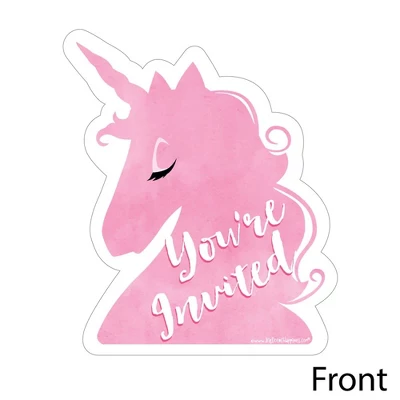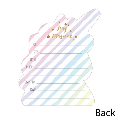 Rainbow Unicorn Fill-In the Blank Invitation Set INCLUDES 12 Magical Unicorn party invitations and 12 premium white envelopes. Rainbow Unicorn fill-in invitations are perfect for any event. The unicorn theme is great for a baby shower or birthday party. Magical Unicorn party invitations SIZE 5 inches by 6.25 inches. The included envelopes measure 5 inches by 7 inches. The back of each Rainbow Unicorn baby shower or birthday party invitation has space to add your party details: For: Date: Time: Place: Given By: RSVP: PREMIUM PARTY INVITATIONS: Magical Unicorn party invitations are professionally printed on heavy-duty card stock paper with a photo-like shine. They are individually inspected, then carefully packaged with our exclusive squiggle flap envelopes, making this magical unicorn stationary set a must-have for any baby shower or birthday party. MADE IN THE USA: Rainbow Unicorn – Magical Unicorn Party Invitations are designed and manufactured at our Wisconsin facility using materials that are Made in the USA. Rainbow Unicorn Fill-In Invitations use a No-Mess Glitter Print: Our invitations are designed with a printed image of glitter, eliminating glitter flake while maximizing bling effect!