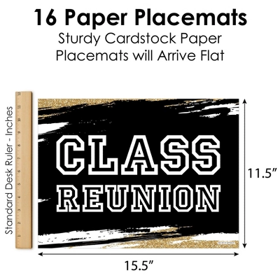 Reunited Placemats INCLUDE: 16 paper placemats. Placemats will arrive flat and party ready! EASY CLEAN UP: Reunited paper placemats SIZE 15.5 inches wide x 11.5 high. Made of sturdy cardstock paper, these disposable placemats will make it easy to clean up after the party is over. Party placemats are perfect for at-home dining tables or to bring to your favorite restaurant as an easy decoration. PARTY TABLE DECORATIONS: Placemats are a fun and easy party table decoration for a Reunited school class reunion party. Use Reunited party placemats to style dining tables, buffet tables, banquet halls, and more! Reunited party table decoration placemats will make a statement however you choose to use them. PAPER PLACEMATS: Set of 16 Reunited placemats are professionally printed on sturdy cardstock paper. Each placemat is individually inspected and carefully packaged to arrive flat. MADE IN THE USA: Reunited paper party placemats are designed and manufactured at our Wisconsin facility using materials that are Made in the USA. Reunited paper placemats use a No-Mess Glitter Print: Our placemats are designed with a printed image of glitter, eliminating glitter flake while maximizing bling effect!