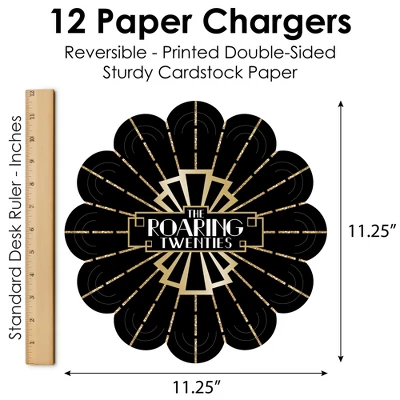 Roaring 20’s Paper Chargers INCLUDES set of 12 reversible round table decorations. Create an exciting look at your Prom, Decades, or Birthday Party when you use paper chargers to elevate your table setting and accent your dinnerware. Tablescape Accent: Roaring 20’s chargers will add a festive flare to your tablescape. Whether it’s a large feast gathering or a close-knit gathering with the family, paper chargers will add a splash of color and are a great alternative to paper doilies. Easy Decor: Dress up your table with layers! Add a plate to the center of paper chargers. 1920s Art Deco Jazz Themed paper charger is an easy solution for your table setting decor and perfect for complementing your tableware. The scallop border can be flared up for an elevated look and the backside can be used for an alternate look. High-Quality Supply: Roaring 20’s Paper Chargers are professionally printed double-sided on sturdy cardstock paper with a photo-like shine. Paper chargers measure 11.25” in diameter and are the perfect final touch to complete your Prom, Retirement, or Birthday Party. Made In The USA: Roaring 20’s Paper Chargers are designed and manufactured at our Wisconsin facility using materials that are Made in the USA. Roaring 20’s Paper Chargers uses a No-Mess Glitter Print: Our Paper Chargers are designed with a printed image of glitter, eliminating glitter flake while maximizing bling effect!