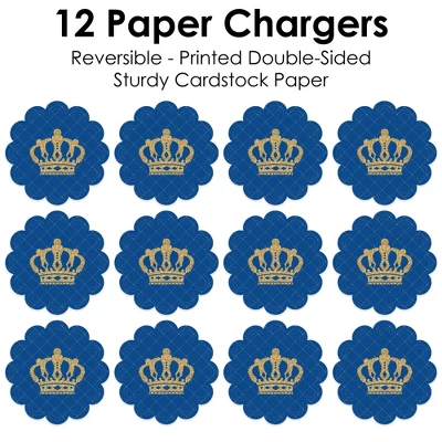 Royal Prince Charming Paper Chargers INCLUDES set of 12 reversible round table decorations. Create an exciting look at your Baby Shower or Birthday Party when you use paper chargers to elevate your table setting and accent your dinnerware. Tablescape Accent: Royal Prince Charming chargers will add a festive flare to your tablescape. Whether it’s a large feast gathering or a close-knit gathering with the family, paper chargers will add a splash of color and are a great alternative to paper doilies. Easy Decor: Dress up your table with layers! Add a plate to the center of paper chargers. Blue & Gold Crown Themed paper charger is an easy solution for your table setting decor and perfect for complementing your tableware. The scallop border can be flared up for an elevated look and the backside can be used for an alternate look. High-Quality Supply: Royal Prince Charming Paper Chargers are professionally printed double-sided on sturdy cardstock paper with a photo-like shine. Paper chargers measure 11.25” in diameter and are the perfect final touch to complete your Baby Shower or Birthday Party. Made In The USA: Royal Prince Charming Paper Chargers are designed and manufactured at our Wisconsin facility using materials that are Made in the USA. Royal Prince Charming Paper Chargers uses a No-Mess Glitter Print: Our Paper Chargers are designed with a printed image of glitter, eliminating glitter flake while maximizing bling effect!