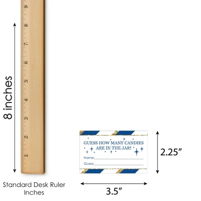 Royal Prince Charming Candy Guessing Game INCLUDES 1 sign with a built-in stand and 40 guessing cards that will look great at your Baby Shower or Birthday Party. Sign measures 7.5” wide by 11” tall and cards measure 3.5” by 2.25” tall. Candy and jar are not included. HOW TO PLAY: Draw attention to your candy jar with the Royal Prince Charming Candy Guessing Game! Place the sign and cards next to your candy jar. Guests can then take a card and guess how many candies are in the jar. The closest guess wins! EASY ASSEMBLY: To use, fold the sides of the stand towards the center. Then, fold down the support piece of the stand until it rests in the notches. Finally, display your Crown Blue and Gold sign next to your container of candy. HIGH-QUALITY SUPPLY: Royal Prince Charming Candy Guessing Game is professionally printed double-sided on sturdy cardstock paper with a photo-like shine. They are individually inspected and then carefully packaged by hand. Sign arrives flat with some easy assembly required. MADE IN THE USA: Royal Prince Charming Candy Guessing Game is designed and manufactured at our Wisconsin facility using materials that are Made in the USA. Royal Prince Charming Candy Guessing Games uses a No-Mess Glitter Print: Our signs and cards are designed with a printed image of glitter, eliminating glitter flake while maximizing bling effect!