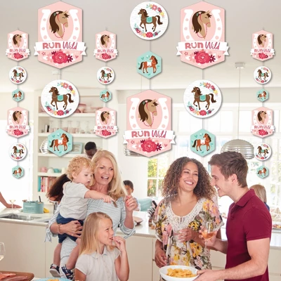 Run Wild Horses Hanging Vertical Decorations INCLUDE 30 shaped pieces, 1 roll clear cording, and assembly stickers. Pretty Pink Floral Pony Vertical Decorations are fun and versatile party danglers for your next Birthday Party. ROOMERIFIC: Run Wild Horses Hanging Vertical Decorations can be displayed at any lengths you choose and make an attractive backdrop for your next Birthday Party. Shaped pieces come in 3 sizes of 10 each, with the following specifications: 10 at 8.5 x 11 inches, 10 at 6.25 x 6.25 inches, and 10 at 4 x 4.5 inches. Hang near a wall to capture fun group photos, or place throughout the room to create a unified theme. These also look amazing when coordinated above gift and buffet tables. DIY DONE RIGHT: Get ready for guests in a snap with this colorful, easy-to-assemble, 30-piece Run Wild Horses Hanging Party Decorations kit. Printed double-sided, each shaped piece includes top and bottom tabs for easy hanging. Simply interlock clear cording into each piece and secure with provided clear stickers. HIGH-QUALITY DECOR: Pretty Pink Floral Pony Hanging Vertical Decorations are professionally printed on heavy-duty cardstock paper. Each piece is individually inspected and carefully packaged by hand. Requires some simple do-it-yourself assembly. Use provided clear cording to display decorations however you prefer. MADE IN THE USA: Run Wild Horses Hanging Vertical Decorations are designed and manufactured at our Wisconsin facility using materials that are Made in the USA.