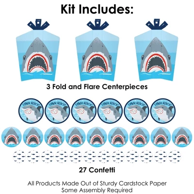 Shark Zone Terrific Table Centerpiece Kit INCLUDES 27 paper confetti and 3 fold and flare centerpieces that will look amazing at your Shark Party or Birthday Party. Make a statement at your celebration with this easy DIY table kit! CIRCLE CONFETTI includes 27 cut-out circle shapes in three different sizes – 12 small circles size 2.75 in, 9 medium circles size 4.25 in, and 6 large circles size 5.5 in. Scatter the Jawsome Ocean themed confetti across your dessert or buffet table for an impressive addition to your decorations. FOLD AND FLARE CENTERPIECES includes 3 table decorations measure 5 inches wide (front/back) x 3 inches wide (sides) x 10.5 inches tall. These paper table decors require easy folding to flare out each centerpiece for your desired look. Simply, use a flat surface to fold along the scored creases to stand the centerpiece upright and be able to balance on its own. Both Fold and Flare Centerpieces & Confetti Are Professionally Printed Double-Sided on Sturdy Cardstock Paper MADE IN THE USA: Shark Zone Terrific Table Centerpiece Kit is designed and manufactured at our Wisconsin facility using materials that are Made in the USA.