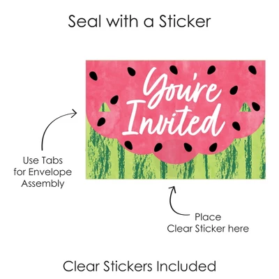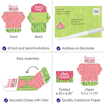 Sweet Watermelon Fold and Send Invitations includes a set of 8 Fruit or Birthday Party invitations. This all-in-one set of invites can be folded into an envelope and comes with clear stickers for secure delivery. Splendid Surprise: Excite your partygoers with these unique and charming invites that turn into envelopes. Melon invitations include fill-in-the-blank space to add your party details. Once assembled, you can directly hand the invites to your recipients or write out the address information on the backside and send your invite via snail mail. Easy Assembly: To transform your invite into an envelope, begin by folding the sides inward. Next, fold and attach the bottom flap by inserting the tabs into the slots of the side flaps. Finally, fold the top flap over and insert its tabs into the slots. Seal your envelope shut using a clear sticker. Practice assembling using the instruction card included. Premium Party Supply: Sweet Watermelon party invitations are professionally printed double-sided on quality cardstock paper with a photo-like shine. When folded, invite cards measure 6.25 inches wide x 4.25 inches tall, and when open, cards measure 9.5 inches wide x 11.75 inches tall. Made In The USA: Melon Fold and Send Invitations are designed and manufactured at our Wisconsin facility using materials that are Made in the USA.