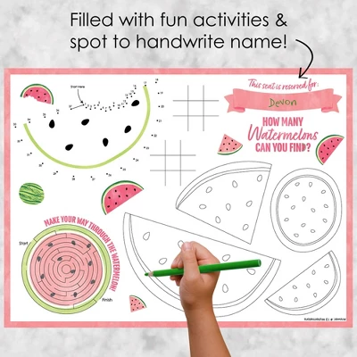 Activity Placemats INCLUDE 16 Sweet Watermelon-themed paper activity placemats for kids. EASY CLEAN UP: Sweet Watermelon paper placemats SIZE 15.5 inches wide x 11.5 high. Made of sturdy cardstock paper, these disposable placemats will make it easy to clean up after the party is over. Party placemats are perfect for at-home dining tables and easy decoration to bring to your favorite restaurant. FUN PARTY ENTERTAINMENT: Activity Placemats are a fun and easy way to keep kids entertained! Each placemat coloring sheet includes matching activities and games. Perfect kids’ activity and party decoration for a Sweet Watermelon birthday party. PAPER PLACEMATS: Sweet Watermelon placemats are professionally printed double-sided on sturdy cardstock paper. Front side features our Sweet Watermelon theme design with a photo-like shine. Flip the placemat over for kid friendly activities. Each placemat is individually inspected and carefully packaged by hand. MADE IN THE USA: Sweet Watermelon paper coloring sheets and activity placemats are designed and manufactured at our Wisconsin facility using materials that are Made in the USA.