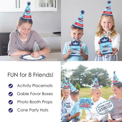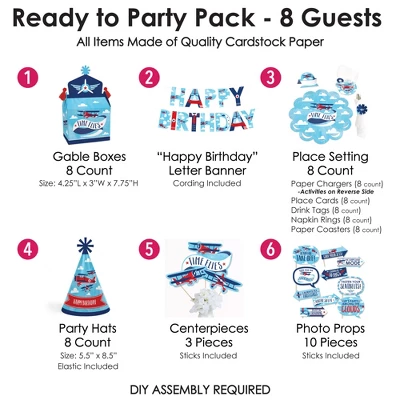 Gable Boxes: includes 8 party favor boxes that are perfect for small gifts and treats. Each Taking Flight – Airplane box size measures 4.25 inches length x 3 inches width x 7.75 inches tall and can store items less than 3.5 inches tall. Printed double-sided, the goodie boxes arrive flat with some easy assembly required. Letter Banner: Welcome party guests with this Happy Birthday banner! This charming letter banner is printed one-sided on cardstock paper and will elevate your party atmosphere. To display, string the included satin cording through each pre-punched hole and then hang it in your desired location. Place Setting Chargerific Kit: Includes 8 double-sided paper chargers, place cards, drink tags, napkin rings, and paper coasters. Easily put together vintage plane place settings that will impress your guests! Each round placemat also comes with activities on the back for added entertainment! Cone Party Hats: Includes 8 paper cone hats that will turn your Vintage Plane Happy Birthday Party into a festive occasion! Each cone hat size 8.5 inches tall and 5.5 inches in diameter at the base and comes with 12-inch elastic chin straps. Cone hats are printed on quality cardstock paper and feature a unique star cut-out decoration at the top. Centerpiece and Photo Props: Includes 3 double-sided cut-outs for an eye-catching table centerpiece and 10 funny photo booth props. The photo props include 4 speech bubble shapes and 6 arrow shapes. Paper sticks, adhesive dots, and clear stickers are also included for easy assembly.