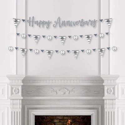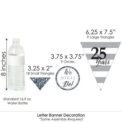 We Still Do – 25th Wedding Anniversary Letter Banner Decoration INCLUDES Happy Anniversary letters, 36 banner pennant pieces, and cord for hanging. We Still Do – 25th Wedding Anniversary banner look great at any venue! VARIETY OF DESIGNS & SIZES! 25th Wedding Anniversary Letter Banner features coordinating pennant pieces and script letters. Decorate your event with 9 large triangle pennants (6.25″ x 7.5″); 9 circle pennants (3.75″ x 3.75″); 18 small triangle pennants (3.25″ x 2″); and anniversary party letters in script style lettering. Easily string them together with the included 10 yards of satin cording. ANNIVERSARY PARTY DECORATIONS: A We Still Do – 25th Wedding Anniversary Bunting Banner is an easy way to decorate for your party and bring your silver twenty-fifth theme to life. Hang at the entrance of your anniversary party, over the food table or candy buffet, and even by the gift table. PREMIUM ANNIVERSARY PARTY SUPPLIES: We Still Do – 25th Wedding Anniversary Letter Banner is professionally printed on sturdy cardstock paper. Each pennant is individually inspected then carefully packaged by hand. anniversary party letter banners require some easy assembly. Simply string the cord through the holes on each letter piece and add triangle and circle pennants to complete the banner. Create multiple rows by cutting the cord to your desired length or hang as one long banner. We Still Do – 25th Wedding Anniversary Party Letter Banner Decoration Pennants Use A No-Mess Glitter Print: Our pennant pieces are designed with a printed image of glitter, eliminating glitter flake while maximizing bling effect!