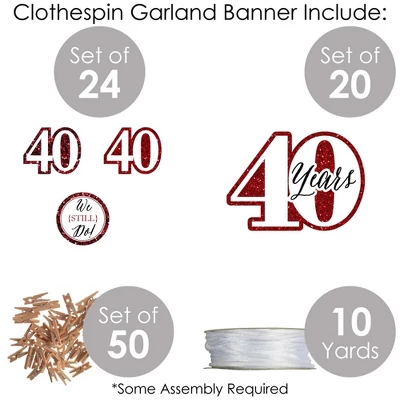 Clothespin Garland Banner – 44 Pieces INCLUDE: 24 small shaped cut-outs, 20 large shaped cut-outs, 50 mini clothespins, and 10 yards white 2mm satin cord. Some simple assembly required. DIY PARTY SUPPLIES: We Still Do – 40th Wedding Anniversary small paper shaped cut-out SIZE 16 40 (2.5 inches x 2 inches), 8 We Still Do! (2.25 inches x 2.25 inches). We Still Do – 40th Wedding Anniversary large paper shaped cut-outs SIZE 20 40 (7 inches x 5 inches). EASY PARTY DECOR: Style any anniversary party with We Still Do – 40th Wedding Anniversary clothespin garland banner. Before hanging, plan out your desired pattern by alternating in sizes. Using a miniature clothespin, clip shapes on the included cord. Hang finished DIY garland banner at the entrance of your party, over mantelpiece, along buffet tables as banner decoration. After the party, reuse the clothespins and cord to hang event photos as a fun keepsake. PREMIUM PARTY DECORATION: We Still Do – 40th Wedding Anniversary large cut-outs are professionally printed double-sided. Small cut-outs are professionally printed with coordinating pattern on back, and all on sturdy cardstock paper with a photo-like shine. They are then individually cut, inspected and carefully packaged. We Still Do – 40th Wedding Anniversary clothespin garland banner is a 44-piece DIY kit that can be used in many ways. MADE IN THE USA: We Still Do – 40th Wedding Anniversary clothespin garland banner decoration kit is designed and manufactured at our Wisconsin facility using materials that are Made in the USA. We Still Do – 40th Wedding Anniversary DIY garland banner use a No-Mess Glitter Print: Our DIY party decorations are designed with a printed image of glitter, eliminating glitter flake while maximizing bling effect!