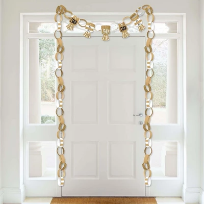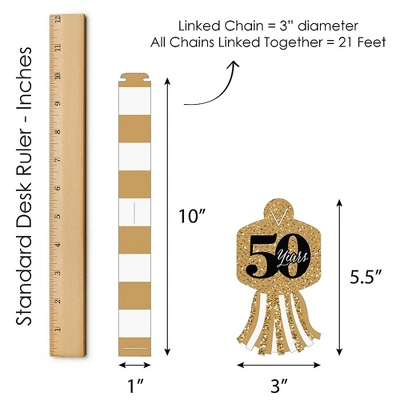 Paper Chains Garland INCLUDES: 90 paper chain links in 3 coordinating patterns and 30 paper tassels in 3 coordinating patterns. Completed paper chains garland measures approximately 21 feet, with some assembly required. One chain link SIZE 10 inches x 1 inch and one paper tassel SIZE 3 inches x 5.5 inches. SIMPLE ASSEMBLY: We Still Do – 50th Wedding Anniversary paper chain decoration kit will arrive flat and is easy enough for the whole family to assemble. First, form a chain link into a circle and insert the tab through the slit. Slide the next chain link through the first link and repeat until all chain links are connected, forming a paper chains garland. Attach paper tassels by inserting paper tassel through center slit located on the chain link. DIY PARTY SUPPLIES: Dress up all areas of your gold and black party with paper chains. Some fun decorating ideas are to wrap paper chains down a staircase railing, hang above doorways, or use as a photo booth backdrop. For an effortless look, stretch paper chains garland down the center of your dining room table. Paper chains can also be used to count down the days to a big event or trip. PREMIUM PARTY DECORATION: Paper chain decorations are professionally printed and double-sided on sturdy cardstock paper, with a photo-like shine. They are then individually cut, inspected, and carefully packaged. We Still Do – 50th Wedding Anniversary paper chains garland is a DIY kit that can be used in many ways. Get inspired with this fun do-it-yourself anniversary party decor kit! MADE IN THE USA: We Still Do – 50th Wedding Anniversary Party paper chains garland is designed and manufactured at our Wisconsin facility using materials that are Made in the USA. We Still Do – 50th Wedding Anniversary paper chains garland use a No-Mess Glitter Print: Our DIY party decorations are designed with a printed image of glitter, eliminating glitter flake while maximizing bling effect!