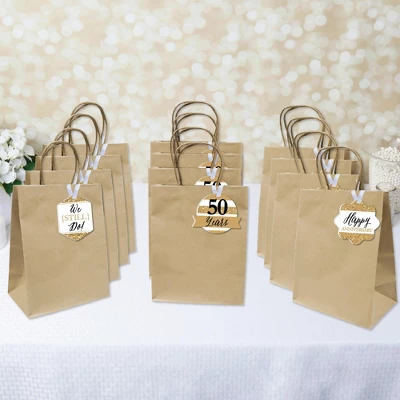 We Still Do – 50th Wedding Anniversary Gift Tag Toppers INCLUDE 12 sturdy, flat, single-sided tags plus 12 satin ribbon strands for hanging. Each set includes 3 different shapes, with 4 of each shape. Requires some easy assembly. These Anniversary Party tags are a great way to dress up gifts or can be used as trendy party favors! GIFT-PERFECT: We Still Do – 50th Wedding Anniversary Gift Tag Toppers come assorted, with SIZES varying between 3″ to 4″ inches wide x 3.5″ to 4″ inches high. Give gifts that extra bling by adding these colorful tags to present boxes, cards, or bags. Made of sturdy PVC material with single-sided print, the backs are white and can be used to write personal messages to recipients. EASY ASSEMBLY: We Still Do – 50th Wedding Anniversary Gift Tag Toppers require some easy assembly. String 1 ribbon through top hole of each gift tag topper and form knot at desired hanging length. Trim down extra ribbon. Holes are pre-cut for your convenience. HIGH-QUALITY FAVORS: Gold 50th Anniversary Gift Tag Toppers are professionally printed on sturdy PVC Material with single-sided print. They are individually inspected and carefully packaged by hand, with coordinating satin ribbon. MADE IN THE USA: We Still Do – 50th Wedding Anniversary Gift Tag Toppers are designed and manufactured at our Wisconsin facility using materials that are Made in the USA. We Still Do – 50th Wedding Anniversary Gift Tag Toppers use a No-Mess Glitter Print: Our gift tag toppers are designed with a printed image of glitter, eliminating glitter flake while maximizing bling effect!