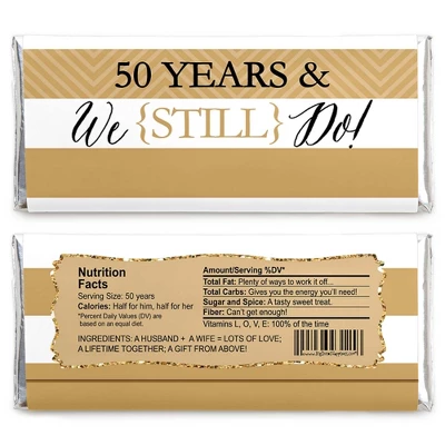 We Still Do Standard Candy Bar Wrapper Kit INCLUDES 24 chocolate bar wrappers and 24 foils, perfect for styling an adorable gold and white candy buffet or unique We Still Do 50th wedding anniversary party favors. We Still Do candy bar wrappers MEASURE 5.25 inches wide x 6.25 inches high and will quickly add the We Still Do party theme to all your sweet treats. It is easy to wrap Hershey’s® standard sized candy bars with these gold and white “Å“50 Years & We Still Do” paper wrappers and foils! EASY PARTY DECORATIONS: Decorated We Still Do candy bars are an easy wedding anniversary party favor to gift all your guests. Set a decorated candy bar at each placesetting, package in small gift bags as a party favor or display in a pretty bowl at your candy buffet. Get creative with your gold and white DIY 50th wedding anniversary party decoration ideas! PREMIUM PARTY SUPPLIES: We Still Do chocolate candy bar wrappers are professionally printed on heavy-duty paper with a photo-like shine. They are individually inspected and carefully packaged by hand with silver foil wraps. Follow the included instructions to quickly wrap a foil around each chocolate candy bar and then add the printed paper wrapper, securing with tape. We Still Do – 50th Wedding Anniversary – Candy Bar Wrapper Party Favors are designed and manufactured at our Wisconsin facility using materials that are Made in the USA. Chocolate Bar Wrappers use a No-Mess Glitter Print: Our party favors are designed with a printed image of glitter, eliminating glitter flake while maximizing bling effect! Please Note: Candy bars are not included but are available at your local grocery store. Candy bar wrappers will fit standard 1.55 oz chocolate bars.