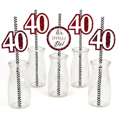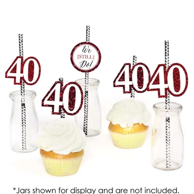 We Still Do Straw Decor INCLUDES 24 ruby and black paper cut outs, 24 coordinating paper straws & clear stickers for easy assembly. We Still Do DIY party supplies are perfect for a 40th wedding anniversary party. We Still Do Straw Decor party kit SIZE #40 measures 2.4″ wide x 2″ tall; circle measures 2.2″ wide x 2.2″ tall; and 24 chevron striped paper straws 7.75″ tall. EASY PARTY DECORATIONS: We Still Do straw decor will add a touch of style to your 40th wedding anniversary party tables. Ruby straw decor will also look great at your beverage bar. Use these adorable 40th anniversary party accessories as straws or swizzle sticks. The paper straws can also be cut in half and used as cupcake picks once the shaped cut out is attached. PREMIUM PARTY SUPPLIES: We Still Do paper cut out straw decorations are professionally printed on heavy-duty cardstock paper with a photo-like shine. They are individually inspected and carefully packaged by hand, along with coordinating paper straws. We Still Do Straw Decor will require some easy assembly. Simply adhere the shaped cut outs to the straws using the included clear stickers. Get creative with your DIY 40th wedding anniversary party decoration ideas! Please Note: Mason Jars shown for display purposes and are not included. We Still Do Paper Straw Decor – 40th Wedding Anniversary Party Striped Decorative Straws use a No-Mess Glitter Print: Our straw decors are designed with a printed image of glitter, eliminating glitter flake while maximizing bling effect!