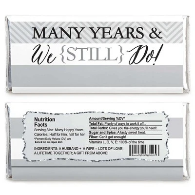 We Still Do Standard Candy Bar Wrapper Kit INCLUDES 24 chocolate bar wrappers and 24 foils, perfect for styling an adorable silver, gray and white candy buffet or unique We Still Do wedding anniversary party favors. We Still Do candy bar wrappers MEASURE 5.25 inches wide x 6.25 inches high and will quickly add the We Still Do party theme to all your sweet treats. It is easy to wrap Hershey’s® standard sized candy bars with these gray and white “Å“Many Years & We Still Do” paper wrappers and foils! EASY PARTY DECORATIONS: Decorated We Still Do candy bars are an easy wedding anniversary party favor to gift all your guests. Set a decorated candy bar at each placesetting, package in small gift bags as a party favor or display in a pretty bowl at your candy buffet. Get creative with your gray and white DIY wedding anniversary party decoration ideas! PREMIUM PARTY SUPPLIES: We Still Do chocolate candy bar wrappers are professionally printed on heavy-duty paper with a photo-like shine. They are individually inspected and carefully packaged by hand with silver foil wraps. Follow the included instructions to quickly wrap a foil around each chocolate candy bar and then add the printed paper wrapper, securing with tape. We Still Do – Wedding Anniversary – Candy Bar Wrapper Party Favors are designed and manufactured at our Wisconsin facility using materials that are Made in the USA. Chocolate Bar Wrappers use a No-Mess Glitter Print: Our party favors are designed with a printed image of glitter, eliminating glitter flake while maximizing bling effect! Please Note: Candy bars are not included but are available at your local grocery store. Candy bar wrappers will fit standard 1.55 oz chocolate bars.