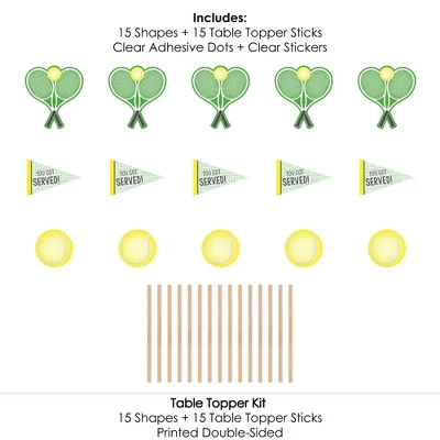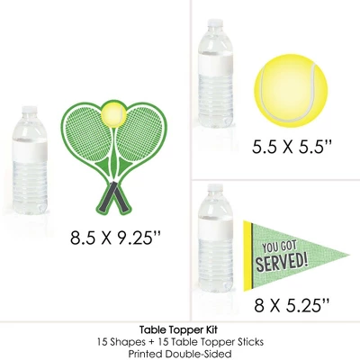 You Got Served – Tennis Centerpiece Sticks INCLUDES 15 You Got Served – Tennis table toppers in three different shapes, 15 sticks and stickers for easy assembly. Tennis party table decorations are perfect for a baby shower or birthday party. You Got Served – Tennis Party Centerpiece Sticks SIZE five tennis rackets table toppers, 8.5″ wide x 9.25″ tall; five tennis ball table toppers, 5.5″ wide x 5.5″ tall; and five banner table toppers, 8″ wide x 5.25″ tall. The unique design and variety of pieces makes this table decoration kit an impressive addition to any tennis theme party. EASY PARTY DECOR: You Got Served – Tennis table decorations can be used as centerpieces when attached to the included sticks and inserted into vases or floral arrangements. They easily accent your baby shower or birthday party candy buffet when you add them to apothecary jars. Table toppers are also a great addition to any photo booth. The large shaped cut outs will make your party pics instantly shareable. Tennis centerpiece sticks are sure to make a statement however you choose to use them! PREMIUM PARTY SUPPLIES: You Got Served – Tennis party table toppers are professionally printed on heavy-duty cardstock paper with a photo-like shine. They are individually inspected and carefully packaged by hand with sticks and stickers for easy assembly. Get creative with your DIY party ideas! MADE IN THE USA: You Got Served – Tennis Baby Shower and Birthday Party Centerpiece Sticks are designed and manufactured at our Wisconsin facility using materials that are Made in America.